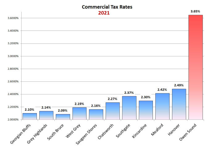 The above graph possibly explains why businesses like, McDonalds Flower Shop, moved to the Sunset Strip. Commercial tax rates must be driving business out of Owen Sound given the vast difference in tax rates. High Commercial also discourages new businesses from locating in Owen Sound. The result is Owen Sound is not growing and the absence of a strong, thriving commercial sector means that good paying jobs are scarce.