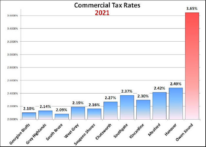 The above graph possibly explains why businesses like, McDonalds Flower Shop, moved to the Sunset Strip. Commercial tax rates must be driving business out of Owen Sound given the vast difference in tax rates. High Commercial also discourages new businesses from locating in Owen Sound. The result is Owen Sound is not growing and the absence of a strong, thriving commercial sector means that good paying jobs are scarce.