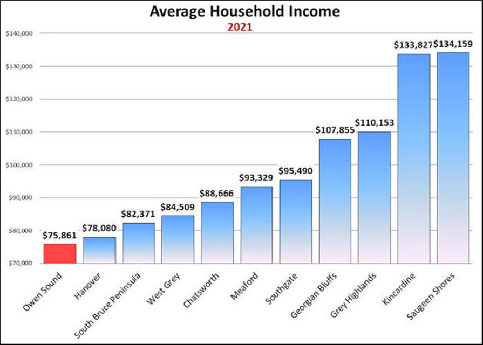 The graph above is developed from data provided in the 2021BMA Study and shows exactly where Owen Sound stands when it comes to Average Household income. Do you wonder why Owen Sound 's Average Household income is so much lower than others in Grey-Bruce? I believe that high taxes play a significant role in keeping wages down. This combined with the fact that people are moving out of Owen Sound and that Owen Sound has had little growth over the last 20 years also suggests that high taxes is a major factor.